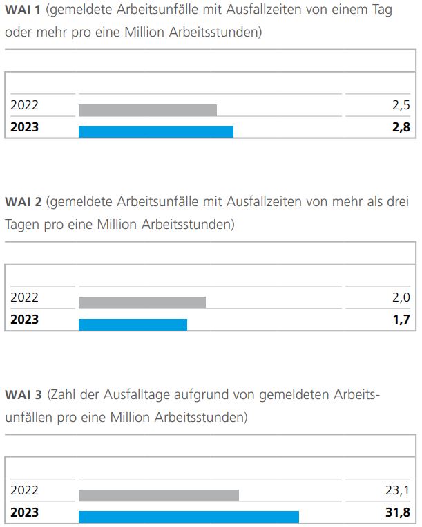 Für 2023 legte ALTANA erneut ambitionierte Zielkorridore für alle drei Unfallkennzahlen fest (WAI 1: 0 bis 2,3; WAI 2: 0 bis 1,5 und WAI 3: 0 bis 27,0) und machte damit noch einmal deutlich, wie wichtig die kontinuierliche Verbesserung der Arbeitssicherheit für das Unternehmen ist. Das Jahr bot allerdings ein herausforderndes wirtschaftliches Umfeld, geprägt von geopolitischen Konflikten und konjunkturbedingten Rückgängen der Nachfrage in den drei großen Wirtschaftsregionen Europa, USA und China. Innerhalb dieser Rahmenbedingungen ist die Zahl der verhaltensbasierten Unfälle gestiegen. Zwar ist es uns gelungen, die Zahl der gemeldeten Arbeitsunfälle an unseren Standorten weiterhin auf einem niedrigen Niveau zu halten, allerdings konnten unsere ambitionierten Ziele auf Gruppenebene nach 2022 auch in 2023 nicht erreicht werden. Global wurden bei ALTANA 31 Unfälle mit Ausfalltagen gemeldet. Dies sind im Vergleich zum Vorjahr zwei Unfälle mehr. Auf Basis der geleisteten Arbeitsstunden ergeben sich folgende WAI-Werte: WAI 1: 2,8 (Vorjahr: 2,5); WAI 2: 1,7 (Vorjahr: 2,0) und WAI 3: 31,8 (Vorjahr: 23,1).