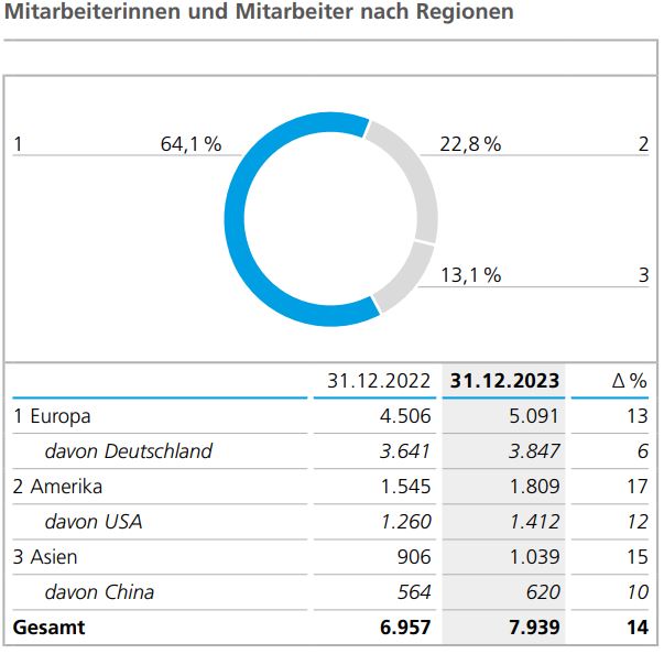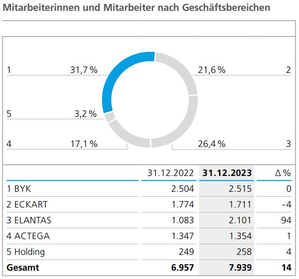 In der regionalen Struktur ergaben sich 2023 gegenüber dem Vorjahr nur geringe Verschiebungen. Mit 5.091 Personen (Vorjahr: 4.506) entfiel auf die europäischen Konzerngesellschaften unverändert der weitaus größte Personalanteil. 3.847 Mitarbeiterinnen und Mitarbeiter (Vorjahr: 3.641) waren zum Jahresende in Deutschland beschäftigt, mehrheitlich an den größten Produktions- und Entwicklungsstandorten der Geschäftsbereiche ECKART und BYK in Hartenstein bzw. Wesel. Durch die Einbeziehung der Von Roll Gesellschaften wuchs die Beschäftigtenzahl in der Schweiz um 213 Personen an. Die Anzahl der Mitarbeiterinnen und Mitarbeiter in Amerika stieg zum Jahresende 2023 um 264 auf 1.809 Personen (Vorjahr: 1.545), wobei der Zuwachs vorrangig auf die nordamerikanischen und die brasilianischen Gesellschaften der Von Roll Gruppe zurückzuführen ist. Die Beschäftigtenzahl der asiatischen Konzerngesellschaften wuchs von 906 Personen im Vorjahr auf 1.039 Personen im Jahr 2023, wobei sich die Beschäftigtenzahl in China und in Indien durch die neuen Von Roll Gesellschaften am stärksten erhöhte.