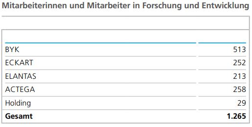 Im Geschäftsbereich ACTEGA stieg die Beschäftigtenzahl im Jahresverlauf um 7 Personen auf 1.354 (Vorjahr: 1.347). Der Zuwachs lag in den Bereichen Produktion und Vertrieb.