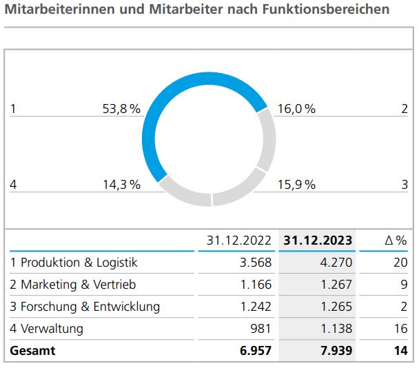 Die funktionale Struktur der Belegschaft veränderte sich im Geschäftsjahr 2023 durch den Erwerb der Von Roll Gruppe geringfügig. Mit 54 % bzw. 4.270 Personen (Vorjahr: 3.568) stieg der Anteil der Beschäftigten in der Produktion an, davon 725 Personen durch den Erwerb der Von Roll Gruppe. Die Anzahl der im Bereich Forschung und Entwicklung beschäftigten Personen erhöhte sich 2023 um 23 auf 1.265 Mitarbeiterinnen und Mitarbeiter (Vorjahr: 1.242), 47 davon aus der Übernahme der Von Roll Gruppe. Im Bereich Marketing und Vertrieb stieg die Anzahl der Beschäftigten im Jahresverlauf 2023 um insgesamt 101 Personen auf 1.267 Personen (Vorjahr: 1.166). Hier wurden 105 Mitarbeiterinnen und Mitarbeiter der Von Roll Gruppe übernommen. Die Verwaltung umfasste im Berichtsjahr 1.138 Beschäftigte (Vorjahr: 981), der Anstieg um 157 Personen beruht auch hier im Wesentlichen auf der Übernahme der Von Roll Gruppe (105 Personen).