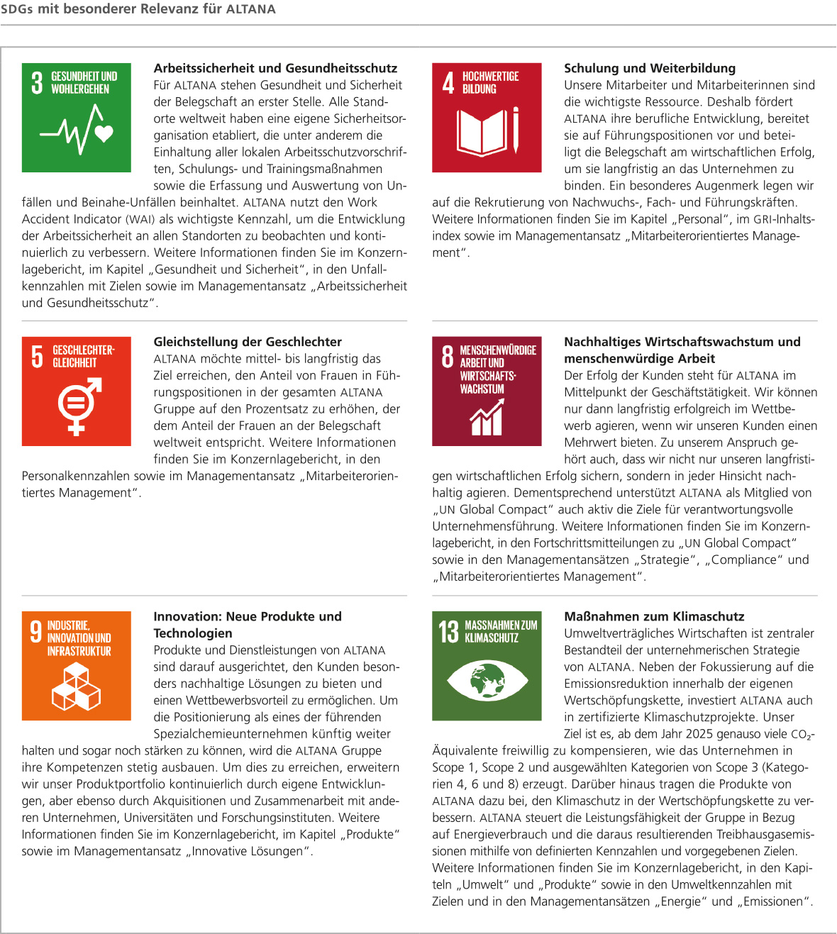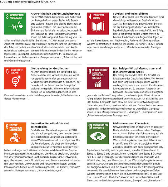 Beim Gipfeltreffen am 25. September 2015 haben die 193 Mitgliedstaaten der Vereinten Nationen die „2030 Agenda für eine nachhaltige Entwicklung“ beschlossen. ALTANA unterstützt diese Initiative der Vereinten Nationen und hat für das Unternehmen die auf der Folgeseite dargestellten Ziele entwickelt.