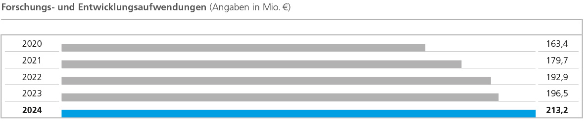 Grundlage für unsere Innovationskraft ist eine offene und dynamische Unternehmenskultur, die weltweit 1.294 Mitarbeiterinnen und Mitarbeitern in unseren Forschungs- und Entwicklungszentren Freiraum für kreatives und unternehmerisches Handeln gibt. Die Ausstattung in unseren Entwicklungszentren ermöglicht unseren Beschäftigten, ihre Ideen in marktreife Lösungen umzusetzen. Unsere Aufwendungen für Forschung und Entwicklung sind im Vergleich zum Vorjahr (196,5 Mio. €) um 16,8 Mio. € auf 213,3 Mio. € gestiegen. Der Rückgang des Umsatzanteils der Forschungs- und Entwicklungsaufwendungen auf 6,7 % (Vorjahr: 7,2 %) ist im Wesentlichen auf den deutlichen Anstieg des Umsatzes gegenüber dem Vorjahr zurückzuführen. Generell stehen unsere Aufwendungen in Verbindung mit dem Erreichen wichtiger Meilensteine, der Umsetzung individueller Kundenwünsche in künftige, innovative Produkte und der langfristigen Ausrichtung unserer Innovationsaktivitäten.