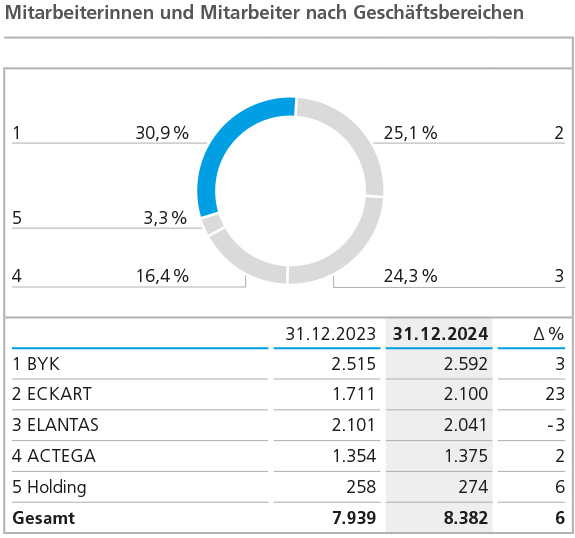 Zum Jahresende 2024 beschäftigten die Gesellschaften der ALTANA Gruppe weltweit 8.382 Mitarbeiterinnen und Mitarbeiter (Vorjahr: 7.939) und verzeichneten insgesamt einen Zuwachs um 443 Personen beziehungsweise 6 % gegenüber dem Vorjahr. Der wesentliche Grund für den Anstieg war die Akquisition der Silberline Gruppe im Januar 2024, die mit 430 Mitarbeiterinnen und Mitarbeitern dazu beitrug.