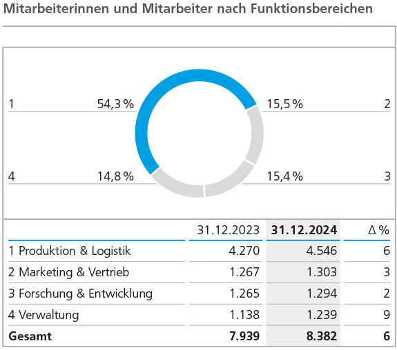 Die funktionale Struktur der Belegschaft veränderte sich im Geschäftsjahr 2024 durch den Erwerb der Silberline Gruppe lediglich geringfügig. Mit jetzt 54 % bzw. 4.546 Personen (Vorjahr: 4.270) stieg der Anteil der Beschäftigten in der Produktion an, davon 298 Personen durch den Erwerb der Silberline Gruppe. Die Anzahl der im Bereich Forschung und Entwicklung beschäftigten Personen erhöhte sich 2024 um 29 auf 1.294 Mitarbeiterinnen und Mitarbeiter (Vorjahr: 1.265), 40 davon aus der Übernahme der Silberline Gruppe. Im Bereich Marketing und Vertrieb stieg die Anzahl der Beschäftigten im Jahresverlauf 2024 um insgesamt 36 Personen auf 1.303 Personen (Vorjahr: 1.267). Hier wurden 36 Mitarbeiterinnen und Mitarbeiter der Silberline Gruppe übernommen. Die Verwaltung umfasste im Berichtsjahr 1.239 Beschäftigte (Vorjahr: 1.138), der Anstieg um 101 Personen beruht auch hier im Wesentlichen auf der Übernahme der Silberline Gruppe (56 Personen).