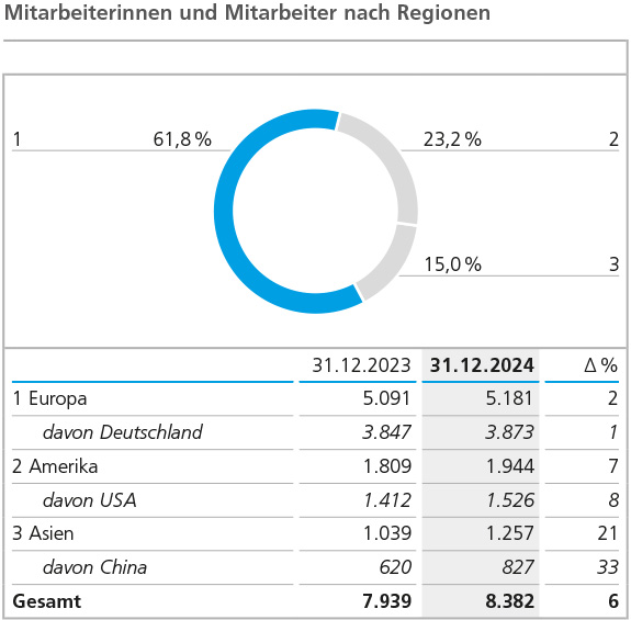 In der regionalen Struktur ergaben sich 2024 gegenüber dem Vorjahr nur geringfügige Verschiebungen von Europa zu Asien. Mit 5.181 Personen (Vorjahr: 5.091) entfiel auf die europäischen Konzerngesellschaften unverändert der weitaus größte Personalanteil. 3.873 Mitarbeiterinnen und Mitarbeiter (Vorjahr: 3.847) waren zum Jahresende in Deutschland beschäftigt, mehrheitlich an den größten Produktions- und Entwicklungsstandorten der Geschäftsbereiche ECKART und BYK in Hartenstein bzw. Wesel. Durch die Einbeziehung der Silberline-Gesellschaften wuchs die Beschäftigtenzahl in Großbritannien um 87 Personen an. Die Anzahl der Mitarbeiterinnen und Mitarbeiter in Amerika stieg zum Jahresende 2024 um 135 auf 1.944 Personen (Vorjahr: 1.809), wobei der Zuwachs vorrangig auf die amerikanische Gesellschaft der Silberline Gruppe mit 123 Mitarbeiterinnen und Mitarbeitern zurückzuführen ist. Die Beschäftigtenzahl der asiatischen Konzerngesellschaften wuchs um 218 Personen von 1.039 Personen im Vorjahr auf 1.257 Personen im Jahr 2024. Der Anteil der neu erworbenen asiatischen Silberline-Gesellschaften betrug 215 Personen, wobei die chinesischen Gesellschaften mit 206 Personen den größten Anteil stellten.