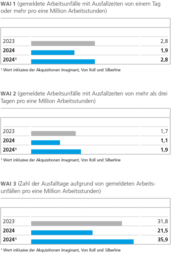 Für 2024 definierte ALTANA erneut ambitionierte Zielkorridore für alle drei Unfallkennzahlen (WAI 1: 0 bis 2,3; WAI 2: 0 bis 1,5 und WAI 3: 0 bis 27,0) und machte damit noch einmal deutlich, wie wichtig die kontinuierliche Verbesserung der Arbeitssicherheit für das Unternehmen ist. Diese Zielwerte bezogen die neu erworbenen Unternehmen noch nicht mit ein, auch da diese einen unterschiedlichen Reifegrad ihrer Sicherheitskultur einbrachten. ALTANA hat das Ziel, die neuen Standorte innerhalb der nächsten drei Jahre auf das Sicherheitsniveau der bestehenden Gesellschaften zu heben. Um die Zielerreichung zu gewährleisten, weist ALTANA zukünftig zwei Sätze an WAI-Kennzahlen aus und vereinbart differenzierte Zielkorridore.