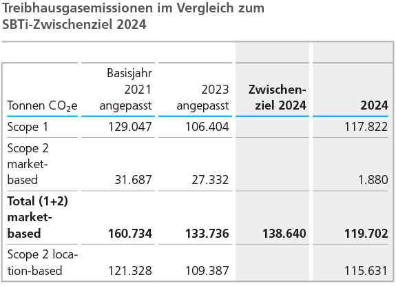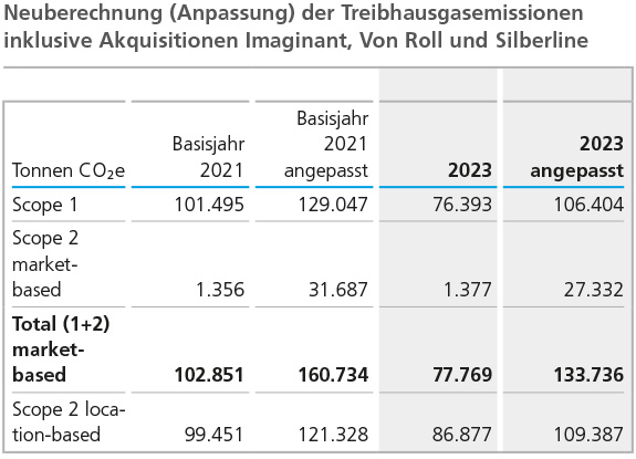 Für den zugekauften Strom in Höhe von 321.599 MWh haben wir die gleiche Menge an Herkunftszertifikaten gemäß den anerkannten Qualitätsstandards (zum Beispiel CoO für Europa, GREEN-E für die USA und IREC für China) und durch lokale Grünstromverträge sowie ein deutsches PPA (Power Purchase Agreement) erworben. Hierbei handelt es sich um Strom, der aus erneuerbaren Energien gewonnen und dessen Herkunft per Herkunftsnachweis transparent gemacht wird. ALTANA plant, die Stilllegung dieser Herkunftsnachweise für 2024 im April 2025 zu finalisieren. Nach der „location-based“ Methode errechnen sich für diesen Strombezug zwar 113.751 Tonnen CO2-Äquivalente, aber dies entspricht, wie zuvor beschrieben, aufgrund der von ALTANA getroffenen Maßnahmen nach der „market-based“ Methode einer CO2-Emission von null. Aus dem Bezug von Dampf, Fernwärme und Druckluft werden nach der „location-based“ Methode und nach der „market-based“ Methode 1.880 Tonnen CO2-Äquivalente in Scope 2 an Treibhausgasemissionen verursacht. Im Jahr 2024 hat ALTANA Langzeit- sowie Kurzzeitziele zur Reduktion der Treibhausgasemissionen erfolgreich von der Science Based Targets initiative (SBTi) validieren lassen. Diese Ziele umfassen die Reduktion der Emissionen in den Scopes 1, 2 und 3. Um den Anforderungen des GHG-Protokolls und der SBTi gerecht zu werden, wurden in diesen Berechnungen rückwirkend auch die Treibhausgasemissionen unserer Akquisitionen von Von Roll, Silberline und Imaginant einbezogen. Diese Anpassungen basieren teils auf Hochrechnungen und teils auf tatsächlichen Ist-Daten. Die neu berechneten Treibhausgasemissionen (Scope 1 und 2) für die Jahre 2021, welches im Rahmen von SBTi als Basisjahr dient, und für 2023 einschließlich der Akquisitionen (angepasst) sind in der folgenden Tabelle den aus den Vorjahren berichteten Werten gegenübergestellt.