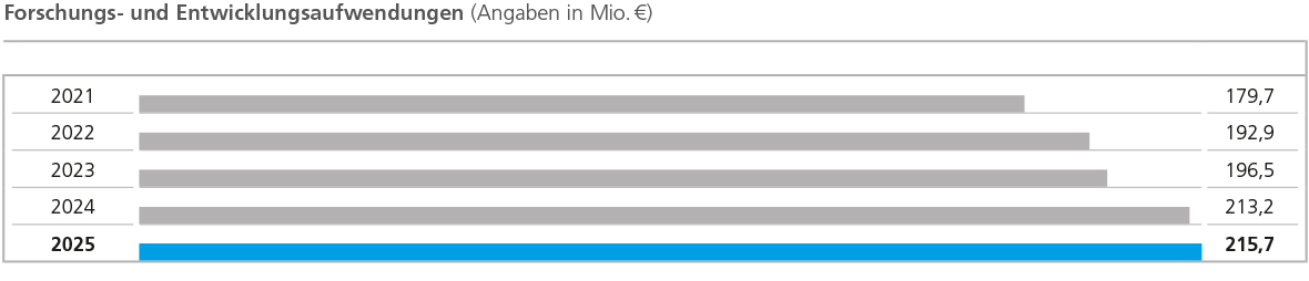 Grundlage für unsere Innovationskraft ist eine offene und dynamische Unternehmenskultur, die weltweit 1.281 Mitarbeiterinnen und Mitarbeitern in unseren Forschungs- und Entwicklungszentren Freiraum für kreatives und unternehmerisches Handeln gibt. Die Ausstattung in unseren Entwicklungszentren ermöglicht unseren Beschäftigten, ihre Ideen in marktreife Lösungen umzusetzen. Unsere Aufwendungen für Forschung und Entwicklung sind im Vergleich zum Vorjahr (213,2 Mio. € ) um 2,5 Mio. € auf 215,7 Mio. € gestiegen. Der Anstieg des Umsatzanteils der Forschungs- und Entwicklungsaufwendungen auf 7,0 % (Vorjahr: 6,7 %) ist im Wesentlichen auf den nominalen Rückgang des Umsatzes gegenüber dem Vorjahr zurückzuführen. Generell stehen unsere Aufwendungen in Verbindung mit dem Erreichen wichtiger Meilensteine, der Umsetzung individueller Kundenwünsche in künftige, innovative Produkte und der langfristigen Ausrichtung unserer Innovationsaktivitäten.