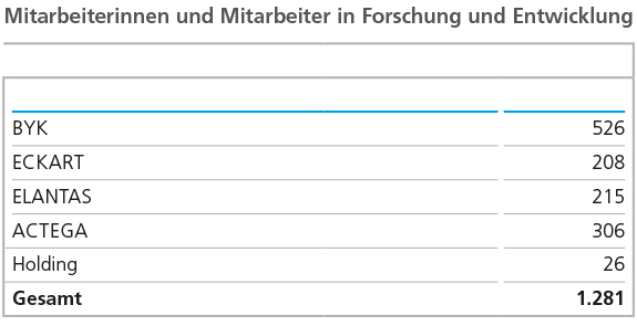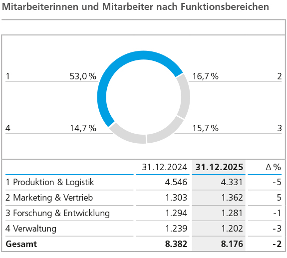 Die funktionale Struktur der Belegschaft veränderte sich im Geschäftsjahr 2025 lediglich geringfügig. Mit jetzt 53 % bzw. 4.331 Personen (Vorjahr: 4.546) sank der Anteil der Beschäftigten in der Produktion, davon um 213 Personen durch die Veräußerungen von Geschäftsaktivitäten im Geschäftsbereich ELANTAS. Die Anzahl der im Bereich Forschung und Entwicklung beschäftigten Personen verminderte sich 2025 um 13 auf 1.281 Mitarbeiterinnen und Mitarbeiter (Vorjahr: 1.294). Im Bereich Marketing und Vertrieb stieg die Anzahl der Beschäftigten im Jahresverlauf 2025 um insgesamt 59 Personen auf 1.362 Personen (Vorjahr: 1.303). Die Verwaltung umfasste im Berichtsjahr 1.202 Beschäftigte (Vorjahr: 1.239), ein Rückgang um 37 Personen.