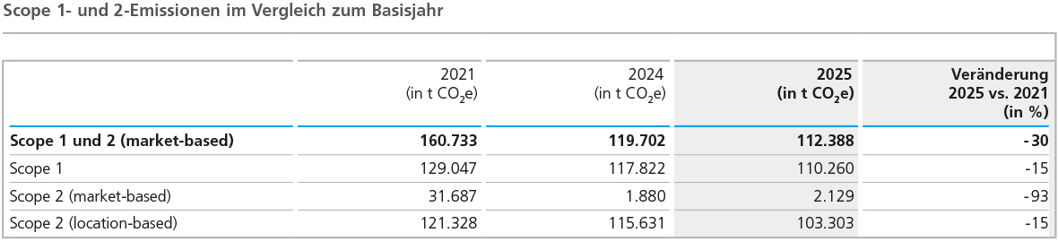Als Grundlage der Berechnung der Scope 1- und 2-Emissionen dienen zum einen die Aktivitätsdaten, insbesondere Energieverbräuche, zum anderen auch Emissionsfaktoren. Die Gesellschaften ermitteln die Energieverbräuche grundsätzlich mittels Versorgerrechnungen. Sofern dies für die letzten beiden Monate des Berichtsjahres zeitlich nicht möglich ist, erfolgt zunächst eine qualifizierte Schätzung der Werte durch die Gesellschaften. Dadurch kann es im Folgejahr – sobald alle Rechnungen vorliegen – noch zu einer nachträglichen Anpassung des Vorjahreswerts kommen.