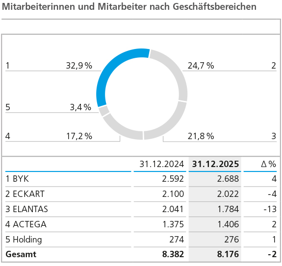 Zum Jahresende 2025 beschäftigten die Gesellschaften der ALTANA Gruppe weltweit 8.176 Mitarbeiterinnen und Mitarbeiter (Vorjahr: 8.382). Der Rückgang um 206 Personen beziehungsweise 2 % gegenüber dem Vorjahr ist im Wesentlichen auf Veräußerungen von übernommenen Geschäftsaktivitäten im Rahmen der Integration der in den Jahren 2023 und 2024 erfolgten Akquisitionen der Unternehmensgruppen Von Roll und Silberline zurückzuführen.