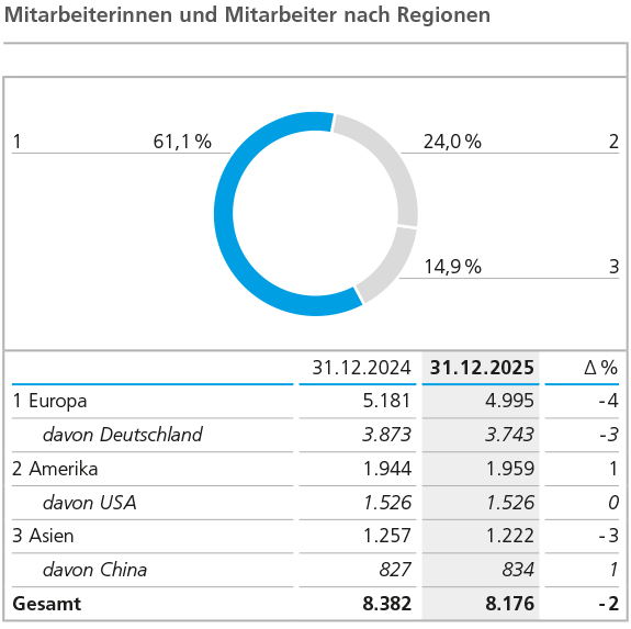 In der regionalen Struktur ergaben sich 2025 gegenüber dem Vorjahr geringfügige Verschiebungen von Europa zu Amerika, maßgeblich bedingt durch die Veräußerung der Geschäftsaktivitäten von ELANTAS im Rahmen der Von Roll Integration. Mit 4.995 Personen (Vorjahr: 5.181) ging die Beschäftigtenzahl der europäischen Konzerngesellschaften um 186 Personen zurück, sie stellten aber nach wie vor den weitaus größten Personalanteil. 3.743 Mitarbeiterinnen und Mitarbeiter (Vorjahr: 3.873) waren zum Jahresende in Deutschland beschäftigt, mehrheitlich an den größten Produktions- und Entwicklungsstandorten der Geschäftsbereiche ECKART und BYK in Hartenstein bzw. Wesel. Die Anzahl der Mitarbeiterinnen und Mitarbeiter in Amerika stieg zum Jahresende 2025 um 15 auf 1.959 Personen (Vorjahr: 1.944). Die Beschäftigtenzahl der asiatischen Konzerngesellschaften reduzierte sich um 35 Personen von 1.257 Personen im Vorjahr auf 1.222 Personen im Jahr 2025, zurückzuführen auf den Verkauf der Geschäftsaktivitäten der Von Roll India.