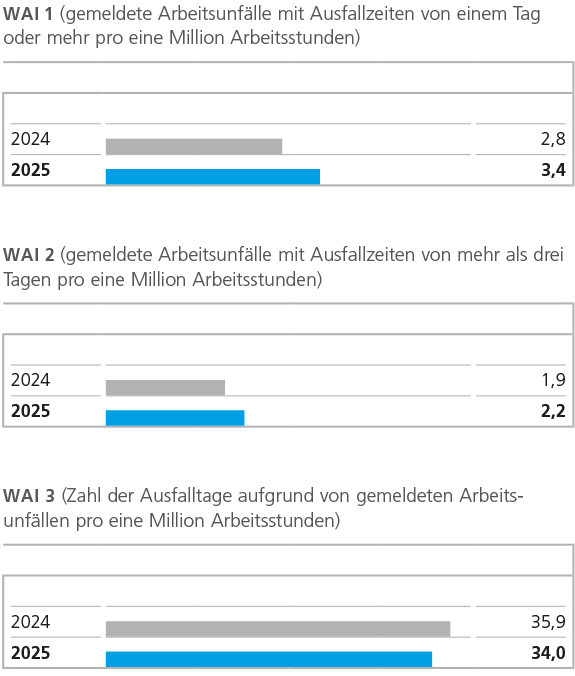 Für 2025 definierte ALTANA erneut ambitionierte Zielkorridore für alle drei Unfallkennzahlen (WAI 1: 0 bis 2,8; WAI 2: 0 bis 1,9 und WAI 3: 0 bis 35,0) und verdeutlichte damit noch einmal, wie wichtig die kontinuierliche Verbesserung der Arbeitssicherheit für das Unternehmen ist. ALTANA legte auch Zielkorridore ohne Berücksichtigung von Von Roll und Silberline fest, da diese einen unterschiedlichen Reifegrad ihrer Sicherheitskultur einbrachten. Exklusive der Von Roll Gruppe und der Silberline Gruppe wurden folgende Zielkorridore vereinbart: WAI 1: 0 bis 2,2; WAI 2: 0 bis 1,5 und WAI 3: 0 bis 27,0.
